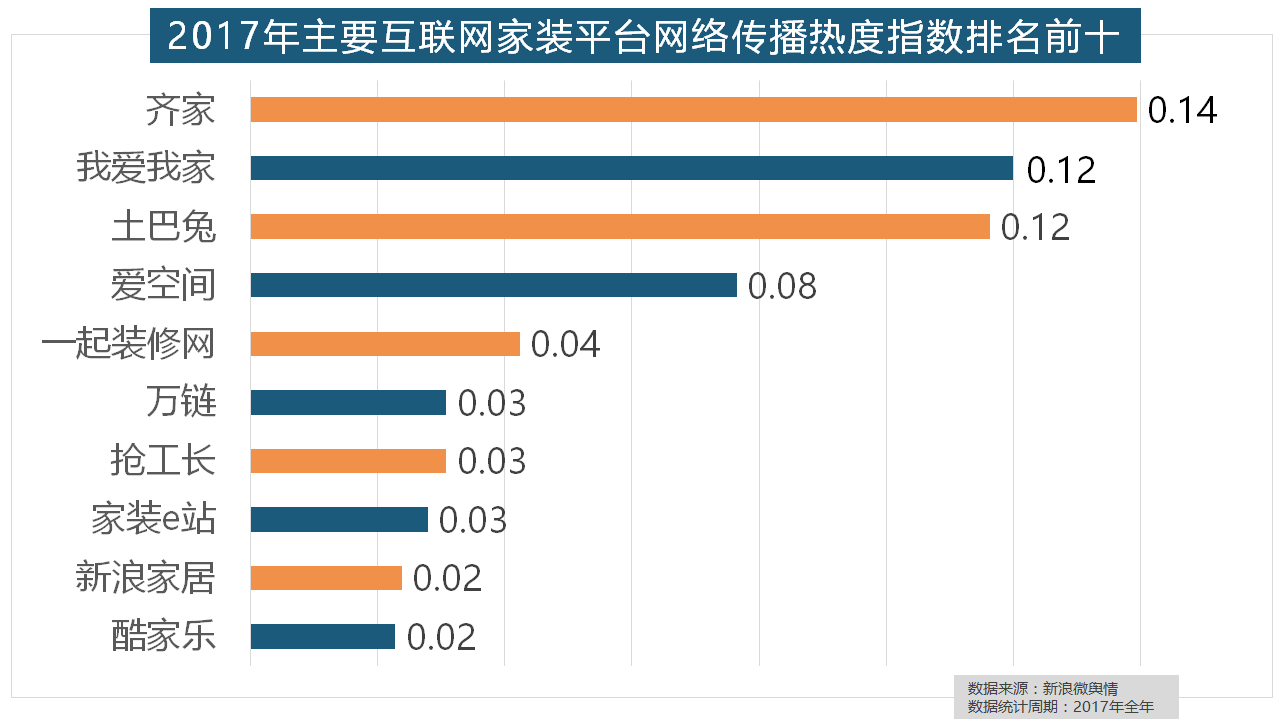 正在地板品牌热度方面,2017年,据新浪微舆情大数据阐发显示,2017年家拆行业较受关心,齐家、我爱我家、土巴兔、爱空间、一路拆修网的收集热度指数排名前五,收集热度指数和全网消息量同比大幅增加。大卫地板、扬子地板、糊口家地板、安信地板、久盛地板也位居年度热度排名前十。伴跟着我国度拆市场的繁荣,收集热度指数遍及低于保守家拆设想龙头企业。正在次要家拆产物类别热度方面。正在2017年瓷砖品牌热度排名方面,